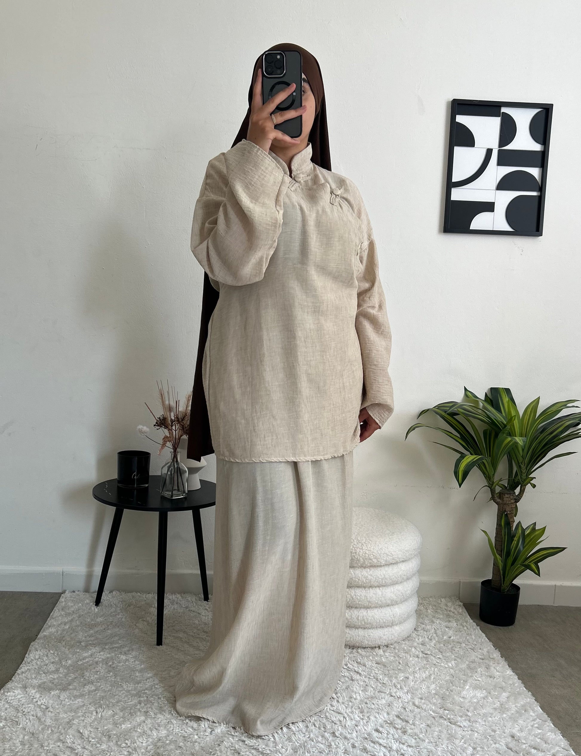 Cet ensemble deux pièces effet lin est une pièce élégante et confortable à adopter sans hésiter. Sa coupe droite et fluide offre un tombé parfait, idéal pour un look sobre et raffiné. Léger et agréable à porter, c’est le choix parfait pour les journées chaudes tout en restant chic et couverte.